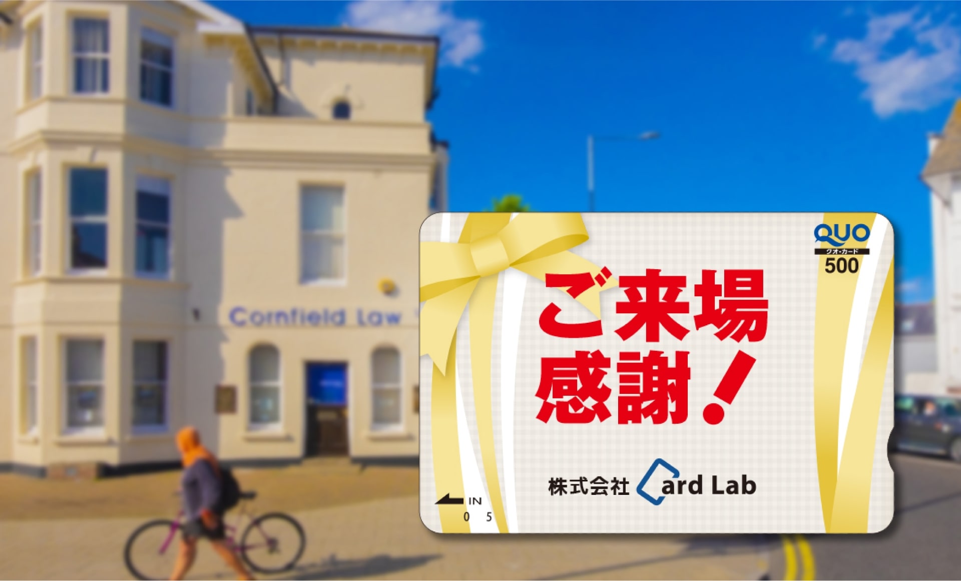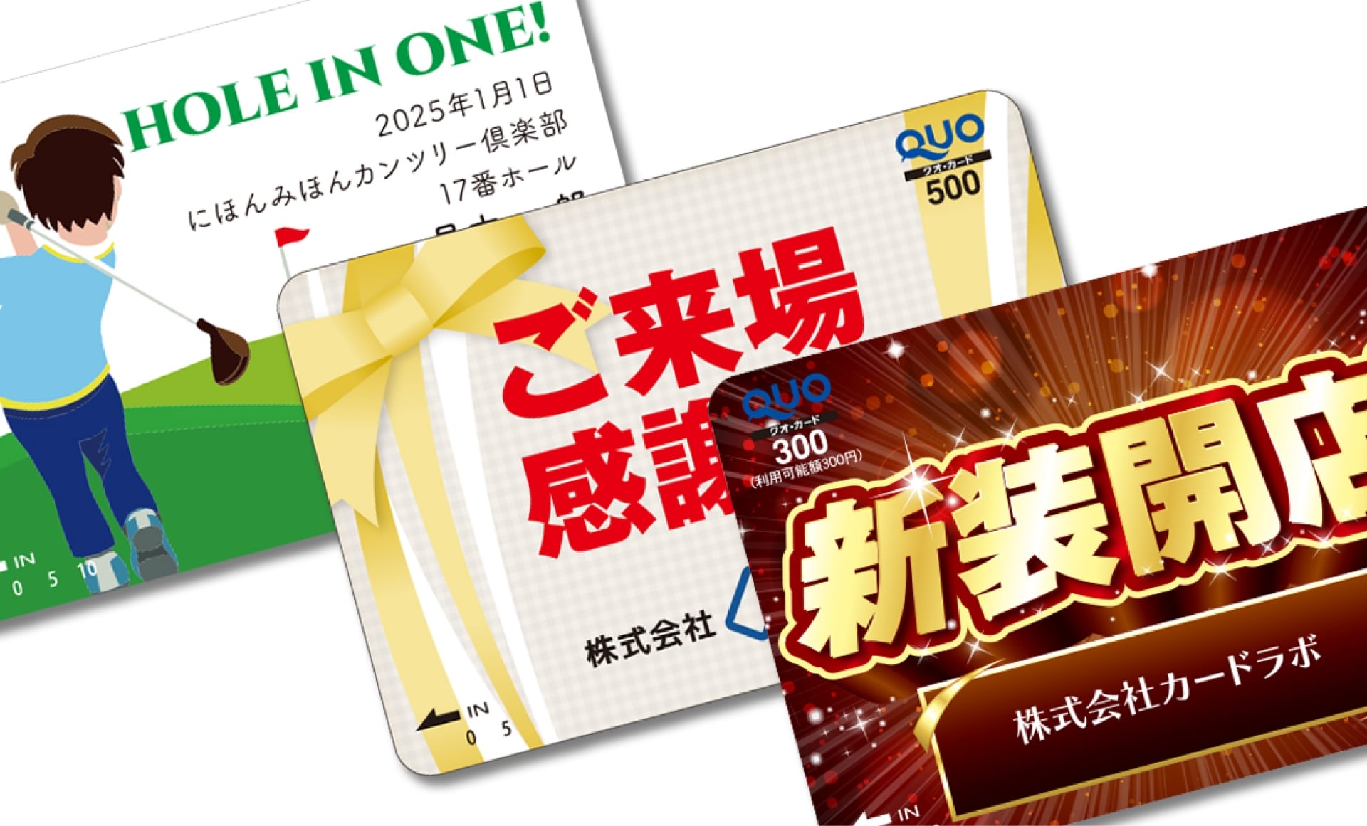 QUOカード(クオカード)は、約6万のお店でご利用いただける、全国共通のギフトカード(商品券)です。全国のコンビニエンスストア・書店・ドラッグストア・ファミリーレストラン・ガソリンスタンドなど実用性が高く、各加盟店でも使用できます。日頃の感謝を伝えたい相手への御礼やキャンペーンの景品など、どなたにも喜ばれるギフトカードをオリジナルデザインで製作できます。
